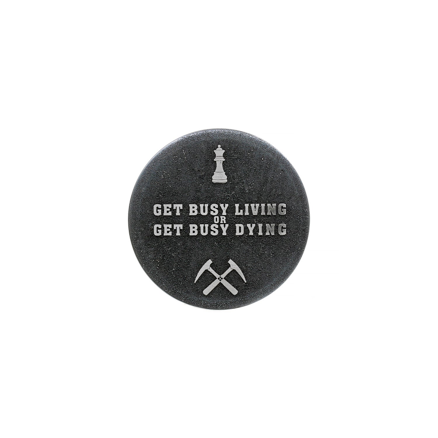 Minted and then laser engraved from solid Iron. Heat blackened, tumbled and oiled for a vintage look.