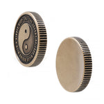 Minted and then laser engraved from solid Bronze or aged Iron.